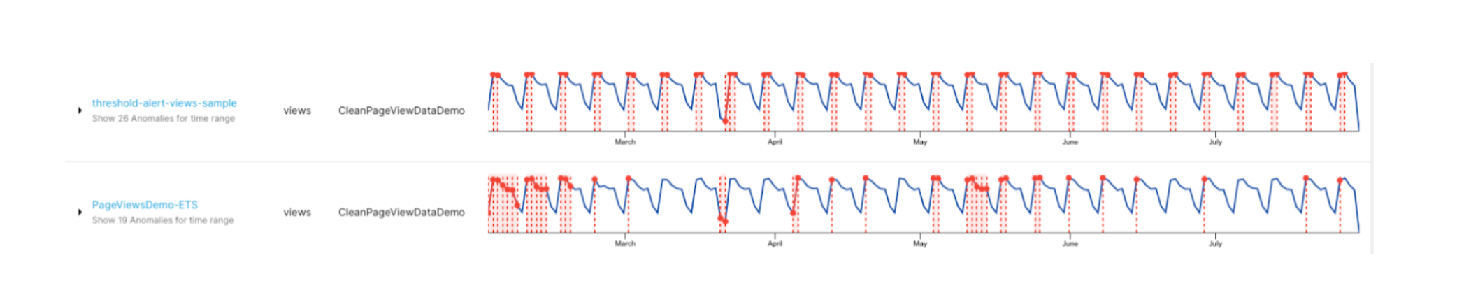 Page views seasonality by the weekend: Many retail websites have spikes or drops during holidays or weekends. Identifying outliers/anomalies in a data stream is useless if the algorithms cannot account for seasonal fluctuations. Here is a sample visualization of daily page views over a period of time as compared to simple threshold-based alerting. As seen here, StarTree ThirdEye does not flag every dip as an anomaly. It can identify the anomalies while considering the seasonality.